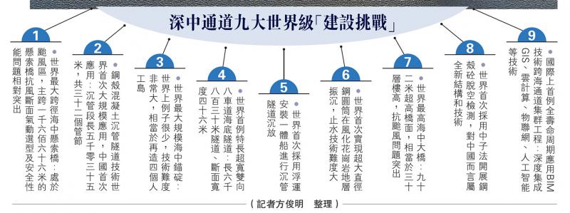 作为“深莞惠”与“珠中江”两大城市群间唯一公路直连通道,广东自贸区、粤港澳大湾区之间的交通纽带,深中通道目前桥、岛、隧工程均已开工。记者近日走访深中通道管理中心及施工现场了解到,该工程总投资约446.9亿元人民币,面临至少9大世界级“建设挑战”,其中海底隧道以“特长超宽双向八车道”标准超过港珠澳大桥成为世界首例。按工期,2019年上半年将完成首节沉管安装,2022年隧道贯通,2023年主体工程竣工,预计2024年全线通车。