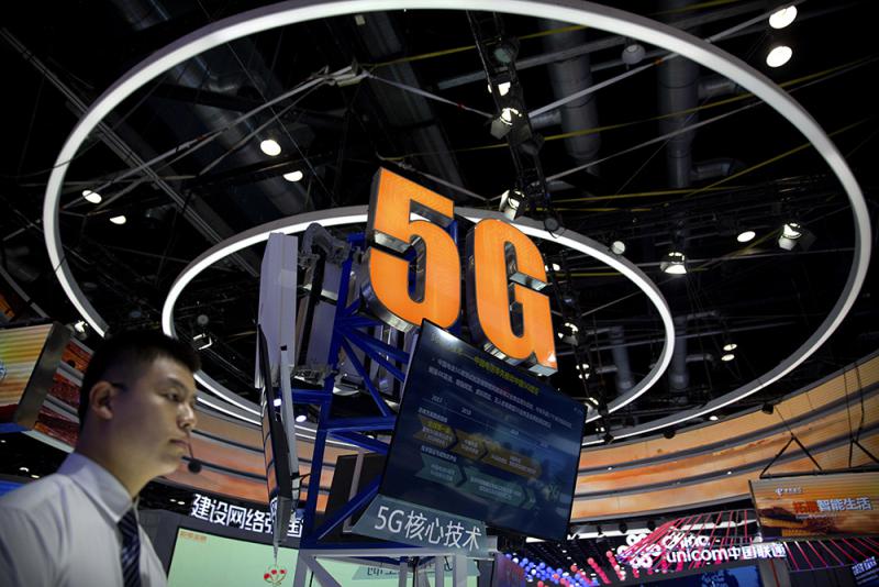 图:在2018年中国国际信息通信展览会上,一名工作人员站在中国电信的5G展台边\资料图片