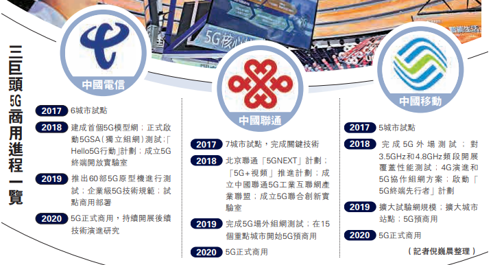 在美国对中国开展技术封锁背景下,中国5G网络推进全面加速。内地官媒7日披露,中国移动、中国电信、中国联通的“5G试验频率使用许可”已获工信部批覆,这预示全国范围的5G试验即将展开。有受访机构表示,鉴于2020年5G将在内地正式商用,预计2019年主流终端芯片供应商将全面推出5G芯片。5G商用手机最快料在明年上半年面世,而三大运营商网络建设投资规模或在1.2至1.5万亿元(人民币,下同)。