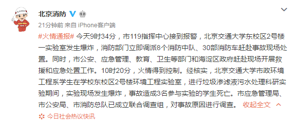 北京交通大学发布通报称,经初步核实,共有3名参与实验的研究生在事故中不幸遇难。事故原因相关部门仍在调查中。此次事故令人无比痛惜,学校已第一时间成立工作小组,党委书记、校长任组长,在现场组织救援、安全防护工作,并及时召开党委常委会扩大会议通报情况、部署工作。学校已全面开展安全隐患排查整改,将全力做好善后事宜,并依法依规严肃问责。