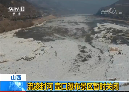 近日,受持续低温天气影响,黄河河面顺流而下的流凌在壶口瀑布处开始堆积。由于壶口瀑布处河面由原来的300米宽缩窄至50米左右,使得飞流直下的流凌不能及时散去而堆积冻结,继而形成封河。目前,黄河壶口段封河长度已达12公里,冰层最厚处多达10余米,局部河面还形成了冰丘。为了保障游客游览安全,山西吉县黄河壶口瀑布景区采取暂时关闭措施。