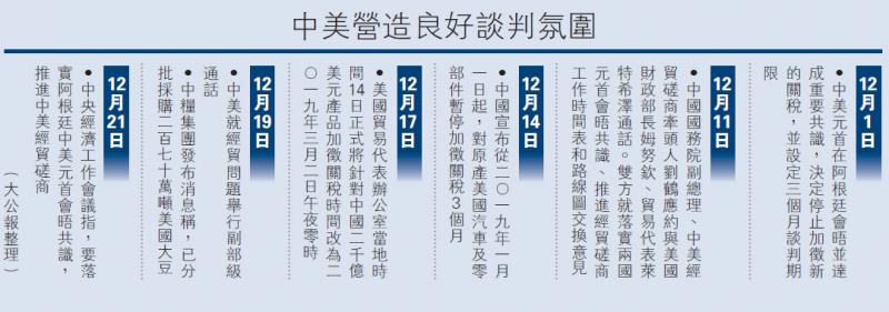 据了解,此次中美谈判前,双方都释放了不少诚意之举,包括中国调降了自美进口汽车关税并重新进口美国大豆等;美国贸易代表办公室也正式将针对中国2000亿美元商品加征关税的时间节点推迟到2019年3月2日零时。此外,中方在年度经济工作会议中提出,要落实阿根廷中美元首会晤达成的共识,推进中美经贸磋商。
