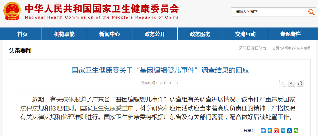 国家卫健委21日表示,近期,有关媒体报道了广东省“基因编辑婴儿事件”调查组有关调查进展情况。该事件严重违反国家法律法规和伦理准则。国家卫生健康委重申,科学研究和应用活动应当本着高度负责任的精神,严格按照有关法律法规和伦理准则进行。国家卫生健康委将根据广东省及有关部门需要,配合做好后续处置工作。