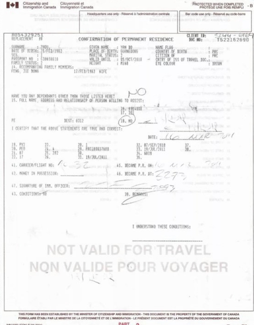 在周延波当选陕西省政协委员后,有网友发帖晒出周延波移民加拿大的一份证明文件。北青报记者看到,这张表格的左上角标有“加拿大移民局”,表格名为“永久居民身份批准证明”(Confirmation of permanent residence)。据该表格显示,这张表格的申请人是“ZHOU,YAN BO”,1962年2月25日出生,身高1米68,眼睛颜色为棕色;护照号码为630656610,有效期限到2018年10月5日。而在“家庭成员”这一栏,显示妻子名为“FENG,JIE DONG”,出生日期为1963年2月17日。在表格一处,还模糊显示有“周延波”的中文签名。