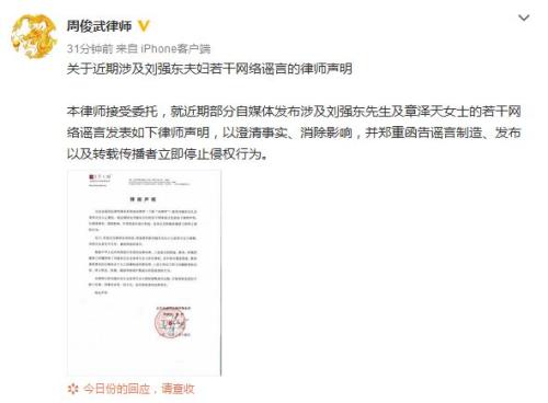 声明称,本律师已经刘强东先生及章泽天女上授权搜集相关证据,并将采取包括但不限于民事、刑事诉讼等一切方式,追究侵权者的法律责任。