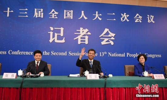 3月7日,十三届全国人大二次会议新闻中心举行记者会,邀请财政部部长刘昆(中),副部长程丽华(右)、刘伟(左)就“财税改革和财政工作”相关问题回答中外记者提问。中新社记者 张娅子 摄