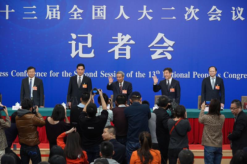 图:十三届全国人大二次会议新闻中心三月九日举行记者会,邀请全国人大农业与农村委员会主任委员陈锡文、全国人大财政经济委员会副主任委员乌日图、全国人大常委会法制工作委员会副主任刘俊臣、全国人大常委会法制工作委员会副主任许安标、全国人大环境与资源保护委员会委员程立峰就“人大立法工作”相关问题回答中外记者提问\中新社