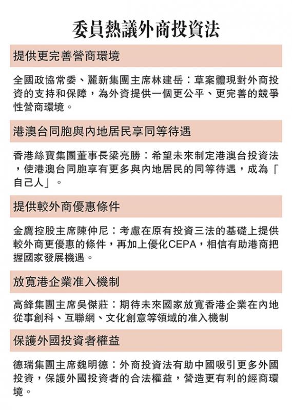 外商投资法是今年两会的热点议题,全国政协委员昨日举行小组会议,讨论外商投资法草案。多名港区政协委员均支持草案,认为能为外资提供一个更公平、更完善的竞争性营商环境,但未来投资内地的港澳台商人需要国家给予更清晰的定位,使他们享有更多与内地居民的同等待遇,这有助港商把握国家发展机遇。\大公报记者 杨州 庄恭诚 北京报道