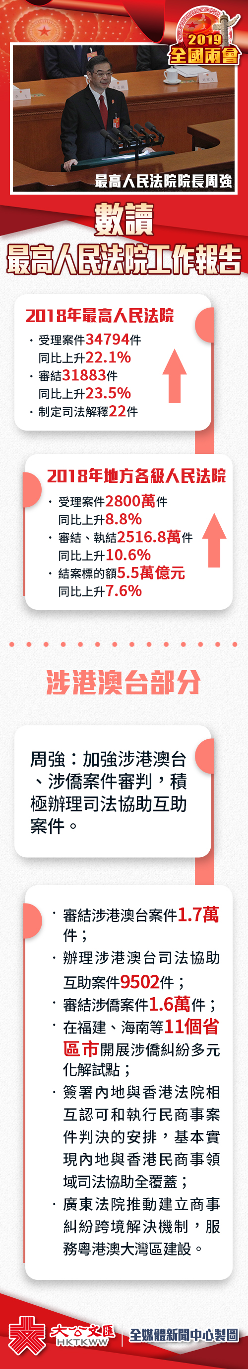 大公文汇全媒体记者北京报道:今日(12日)上午,十三届全国人大二次会议在北京人民大会堂举行第三次全体会议,审议最高人民法院工作报告。最高人民法院院长周强作报告时表示,2019年将加强涉港澳台、涉侨案件审判,积极办理司法协助互助案件。