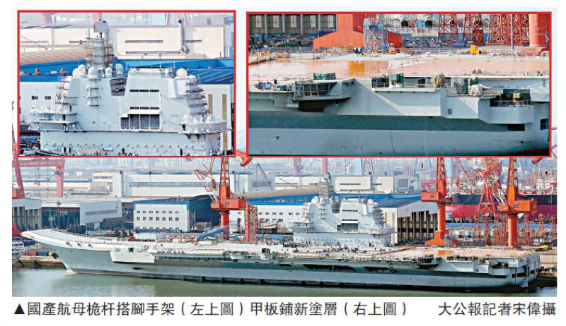 自2月下旬开始,国产航母有“马甲军团”现身,并随后进行了仅有4天半的第五次试航。外界据此认为,其可能提前服役,或与辽宁舰同时现身海上阅兵,甚至有先阅兵再返厂舾装的猜测。但国产航母舰岛再搭脚手架,大面积摊铺新涂层,让外界所谓“献礼工程”的猜测不攻自破。