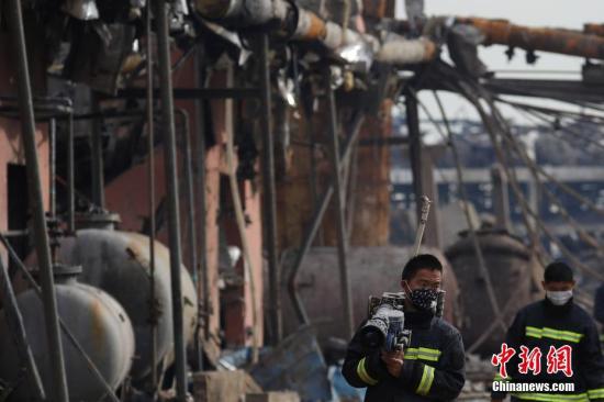 3月22日,消防员在江苏盐城响水县陈家港镇江苏天嘉宜化工有限公司爆炸核心周边开展救援工作。中新社记者 泱波 摄