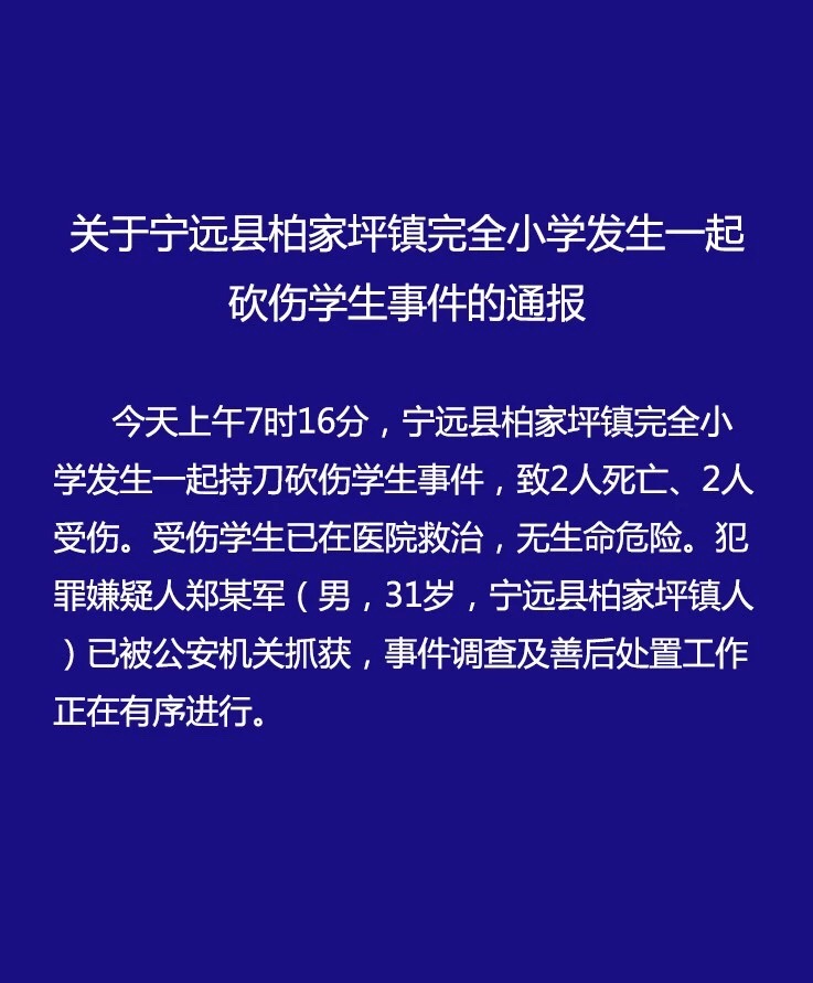 据宁远县委宣传部通报:今天(3日)上午7时16分,湖南永州宁远县柏家坪镇完全小学发生一起持刀砍伤学生事件,致2人死亡、2人受伤。受伤学生已在医院救治,无生命危险。