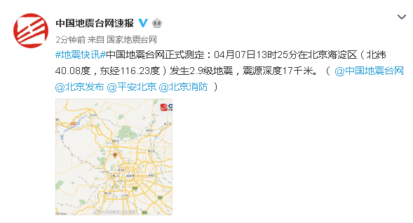 中国地震台网正式测定:04月07日13时25分在北京海淀区(北纬40.08度,东经116.23度)发生2.9级地震,震源深度17千米。