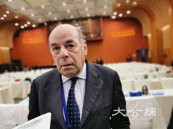 “欧洲之友”董事会理事保罗·瑞维尔15日在欧美同学会第二届国际智库论坛间歇接受大公文汇全媒体采访;记者张帅摄