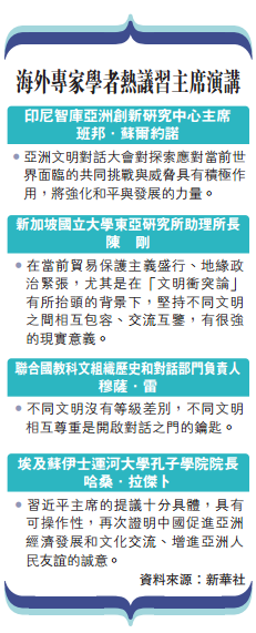 【大公报讯】草木生长,共襄盛举。15日上午,国家主席习近平在亚洲文明对话大会开幕式上发表题为《深化文明交流互鉴 共建亚洲命运共同体》的主旨演讲,来自亚洲47个国家和五大洲的各方嘉宾现场聆听。“我们要加强世界上不同国家、不同民族、不同文化的交流互鉴,夯实共建亚洲命运共同体、人类命运共同体的人文基础。”习近平主席站在亚洲文明乃至整个人类文明发展的高度,深刻阐释中国的文明观,为应对全球挑战、促进和平发展提出中国主张、贡献文明方案,赢得各方广泛赞誉。