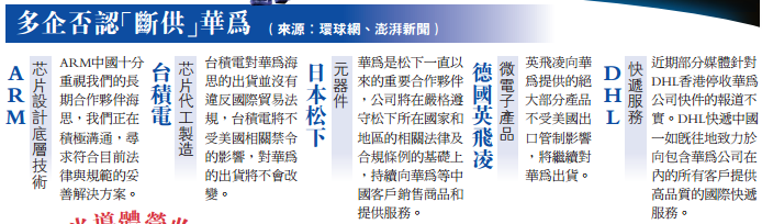 此前一天,英国广播公司在一篇报道中称,ARM告诉员工,必须暂停与华为的业务。ARM本身并不制造计算机芯片,其主要的业务是对外授权其半导体技术,把技术和工具打包售卖,买到的企业在一定期限内可以使用ARM技术。ARM的设计构成了全球大多数移动设备处理器的基础,华为旗下的海思半导体公司也使用ARM底层技术。