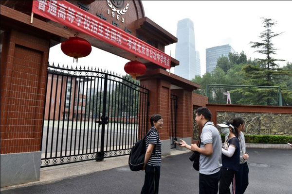 6日下午,北京市日坛中学考点前部分家长提前“踩点”(翁奇羽/摄)