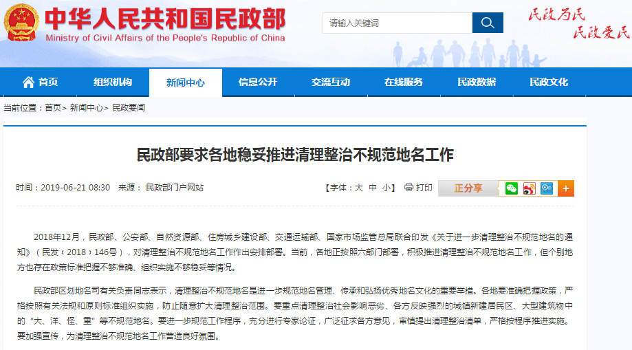 民政部要求各地稳妥推进清理整治不规范地名工作。6月21日,民政部官网发布消息称,2018年12月,民政部、公安部、自然资源部、住房城乡建设部、交通运输部、国家市场监管总局联合印发《关于进一步清理整治不规范地名的通知》(民发﹝2018﹞146号),对清理整治不规范地名工作作出安排部署。当前,各地正按照六部门部署,积极推进清理整治不规范地名工作,但个别地方也存在政策标准把握不够准确、组织实施不够稳妥等情况。