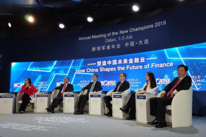 图:2019世界经济论坛新领军者年会1日在辽宁大连启幕。与会嘉宾在“塑造中国未来金融业”分论坛上围绕中美贸易摩擦下的金融市场展开分析研讨\大公报记者宋伟摄