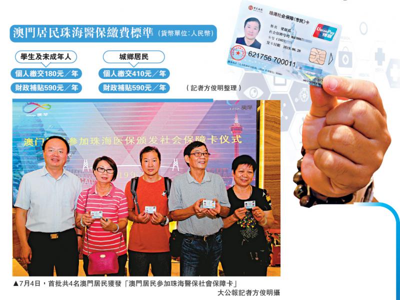 粤港澳大湾区跨境参加医疗保险取得新突破。4日,首批4名澳门居民在珠海横琴自贸区领取了“澳门居民参加珠海医保社会保障卡”。据悉,只要在横琴居住办理了港澳台居民居住证的澳门居民,都可领取医保卡,最低年缴180元(人民币,下同)即可享全年医保,享受医疗费用报销70%的医疗保障。横琴新区党委副书记李伟辉表示,该举措是对国家支持在内地居住港澳台居民依法参加社会保险决策的具体实践,通过试点还将为港澳居民跨境养老、就业、教育等更多社会政策的协同创新提供经验。\大公报记者 方俊明珠海报道
