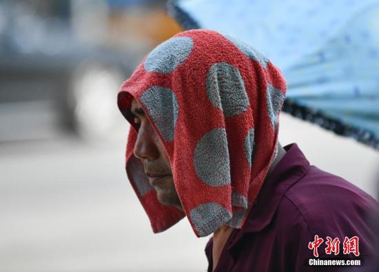8月1日,北京高温天气持续,一男子用湿毛巾遮阳降温。中新社记者 张兴龙 摄