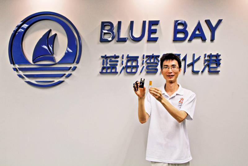 图:团队创始人之一的易俊向记者展示芯片LTU31:薄薄一层,形状类似一个黑色胶纸\大公报记者何花摄