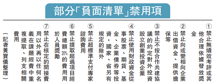 负面清单设定禁止经费使用的条件,凡列入禁止类的经费使用情况一律不能进行开支。同时,负面清单以绩效为导向,广州市科技行政主管部门将定期对相关清单进行评估,根据评估情况适当调整。