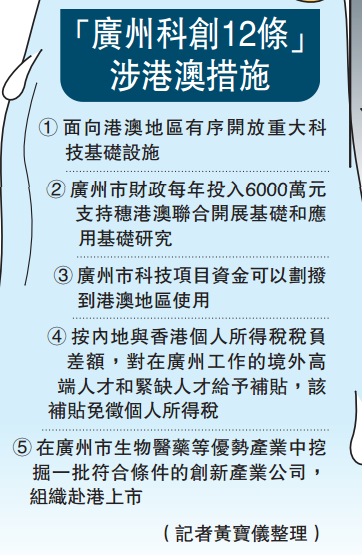近年广州持续加大政策供给,促进创新资源集聚,参与共建粤港澳大湾区国际科技创新中心建设。王越西在发布会上重点介绍了近期公布的《广州市进一步加快促进科技创新的政策措施》,也就是“广州科创12条”。当中最受港澳社会关注的一条,正是财政科研资金跨境使用。文件条款明确“允许项目资金直接拨付至港澳两地牵头或参与单位”,并提出建立资金拨付绿色通道,香港科技大学成为首个受惠单位。