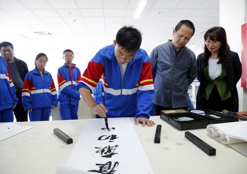 图:今年秋季开学季,普通高中思想政治、语文、历史三科新教材将进入六省市校园。图为北京五中通州校区举办“一缕墨香”书法交流活动\资料图片