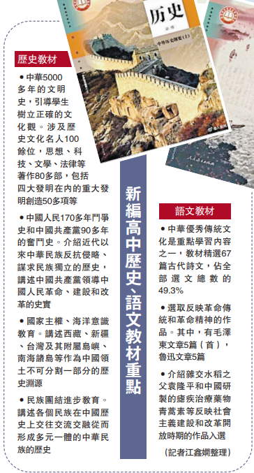 今年9月秋季开学季,普通高中思想政治、语文、历史三科新教材将进入北京、天津、辽宁、上海、山东、海南等六省市的校园。教育部27日举行发布会称,2022年前所有省份都将使用新教材。其中,历史教材将重点突出国家主权、海洋意识教育。以史实为依讬,讲述西藏、新疆、台湾及其附属岛屿、南海诸岛等作为中国领土不可分割一部分的历史渊源,增强学生维护国家统一和国家主权安全的意识。教材还呈现了中华5000多年文明史,内容涵盖中华优秀传统文化包含的核心理念等。\大公报记者江鑫娴 北京报道