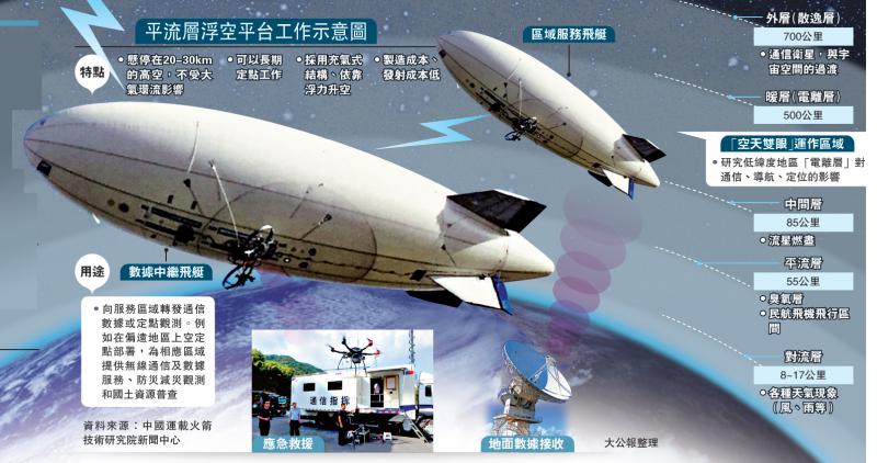 遥感技术与应用专家童庆禧院士及其团队提出了关于天空地一体化信息技术系统的设想。他介绍说,天空地一体化信息技术系统由卫星、浮空平台和移动平台组成。其中,平流层浮空平台是一种新型无人飞行器遥感应用平台,具有飞行高度高、时间长、机动灵活等优势,是区域性遥感的最佳平台。通过建设“卫星之下、无人机之上”平流层空间系统,与现有的卫星、飞机和地面平台协同使用,可以实现对粤港澳大湾区的通信中继、遥感观测、环境监测等,是构建大湾区立体信息网络不可或缺的组成部分。