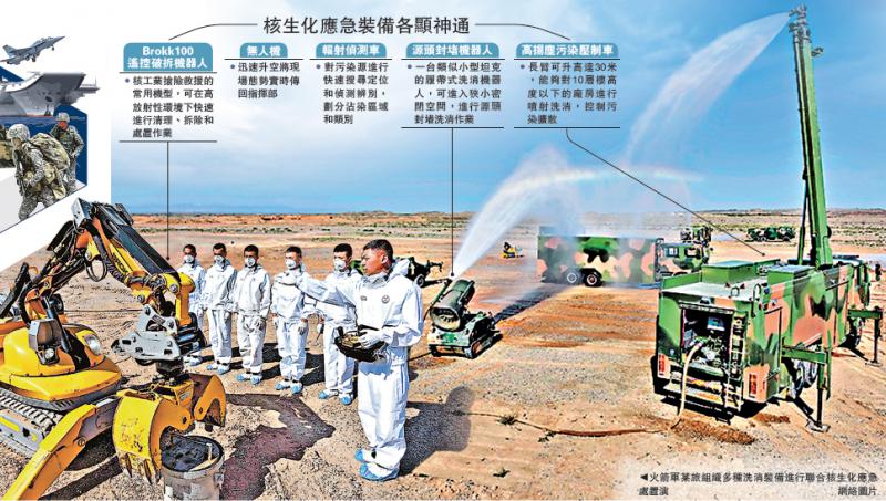 火箭军手握执行国家核威慑和核打击的大国重器,防范和应对核泄漏事故,确保核武库安全,是其日常重点工作之一。日前,火箭军组织了近些年核应急救援装备最多的多一次实兵实装演习,除模拟遭敌方精确核打击之外,实战场景还包括自然地害引发核污染、遭受敌军化武袭击等,以提升部队核生化应急处置实战能力,为确保“大国长剑”核导弹安全保驾护航。核应急是高度危险的任务,随着技术水平的提高,辐射侦测车、污染压制车等多种装备加入生化战场,无人机、遥控机器人等无线遥控设备投入核应急工作中,可替代士兵完成多种危险任务。