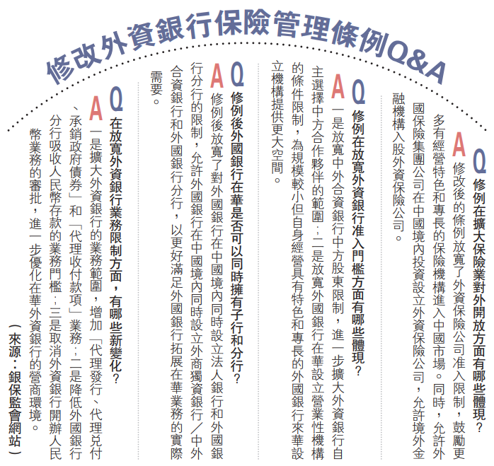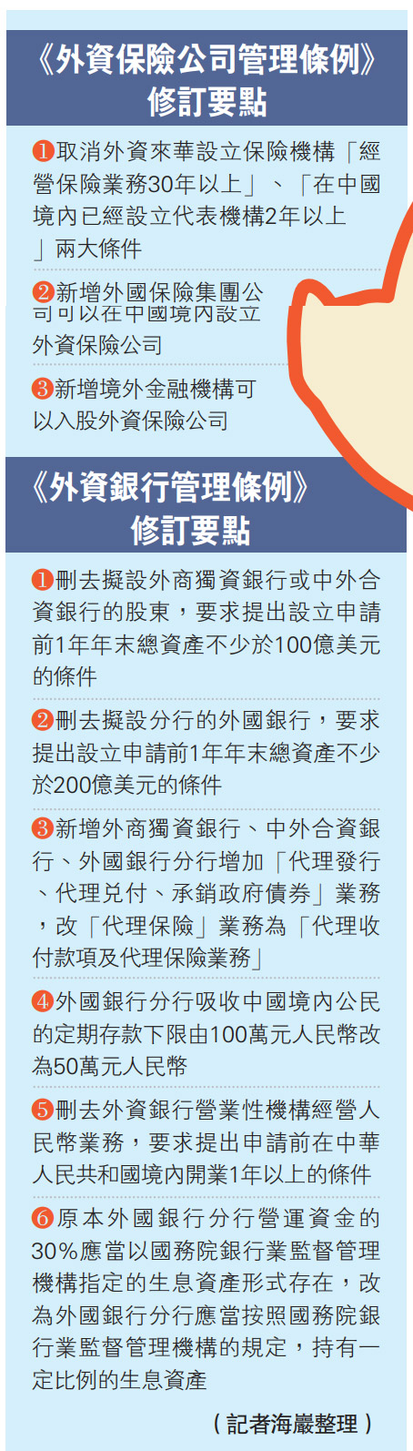为进一步扩大金融业、保险业对外开放,中国国务院决定对《中华人民共和国外资银行管理条例》及《中华人民共和国外资保险公司管理条例》部分条款予以修改。中国银行保险监督管理委员会首席律师刘福寿15日在国新办吹风会上表示,此次修改,取消了对外资金融机构经营年限、股比、规模等限制,放宽了外资银行和保险公司的准入条件,允许设立独资银行和外资保险公司,将吸引更多机构来华经营。