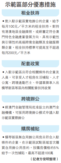 目前《横琴新区支持粤澳跨境金融合作(珠海)示范区发展的暂行办法》已印发,入驻企业享租金购房补贴等。其中,对入驻示范区实地办公的企业,给予每月100元/平方米的租金扶持;而持有港澳地区金融牌照的,租金扶持标准可提高至不超过每月200元/平方米。