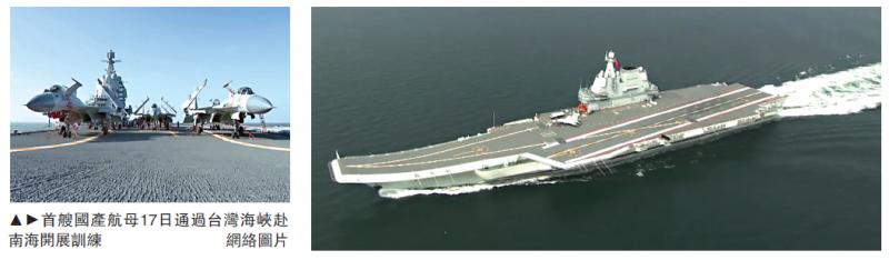 【大公报讯】综合中新社、新华社报道:中国海军新闻发言人程德伟介绍,11月17日,中国第二艘航母顺利通过台湾海峡,赴南海相关海域开展科研试验和例行训练。中国外交部发言人耿爽18日表示,这是中方舰艇编队在自己家门口正常训练,不值得大惊小怪。