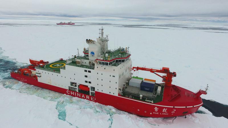 中国第36次南极科学考察队搭乘的“雪龙2”号极地科考破冰船19日抵达南大洋普里兹湾浮冰区,即将迎来破冰能力大考,为我国另一艘极地科考破冰船“雪龙”号开道,帮助它突破陆缘冰阻挡,尽量靠近中山站,以便开展大规模海冰卸货。图为“雪龙2”号(前)与“雪龙”号一道向中山站挺近(无人机拍摄)。 (新华社)