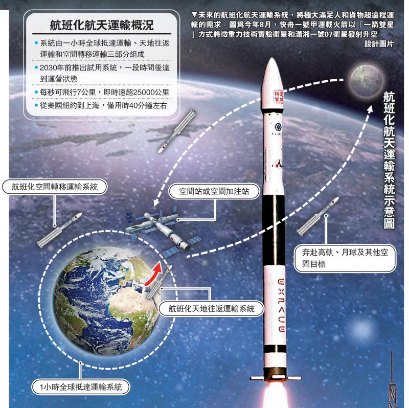 图:未来的航班化航天运输系统,将极大满足人和货物超远程运输的需求。图为今年8月,快舟一号甲运载火箭以“一箭双星”方式将微重力技术实验卫星和潇湘一号07卫星发射升空/设计图片