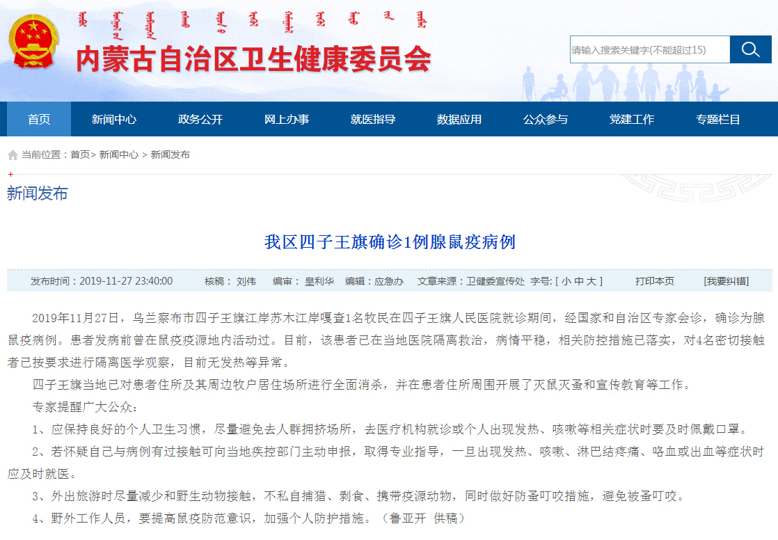据内蒙古自治区卫健委网站消息,2019年11月27日,乌兰察布市四子王旗江岸苏木江岸嘎查1名牧民在四子王旗人民医院就诊期间,经国家和自治区专家会诊,确诊为腺鼠疫病例。患者发病前曾在鼠疫疫源地内活动过。目前,该患者已在当地医院隔离救治,病情平稳,相关防控措施已落实,对4名密切接触者已按要求进行隔离医学观察,目前无发热等异常。