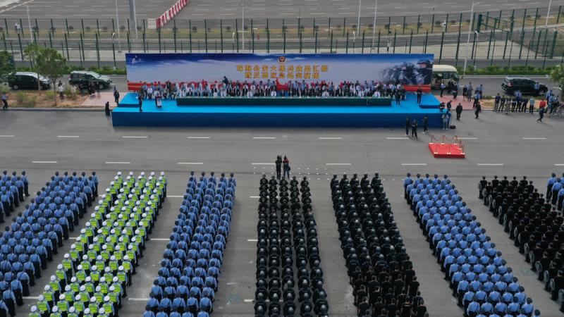广东省23个分会场约1.9万人同步宣誓,主会场由特警、交警、综合警种组成18个方阵约3700名警员入场集结,并佩剑齿虎突击车、轮式装甲车等先进装备