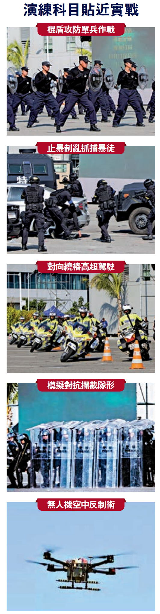 在深圳举行,集结1.2万名警力,50辆装甲车、5架直升机、2辆水陆两栖车等装备齐上阵,展开反恐处突、海空联合巡逻、防暴等演练