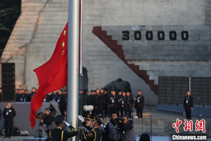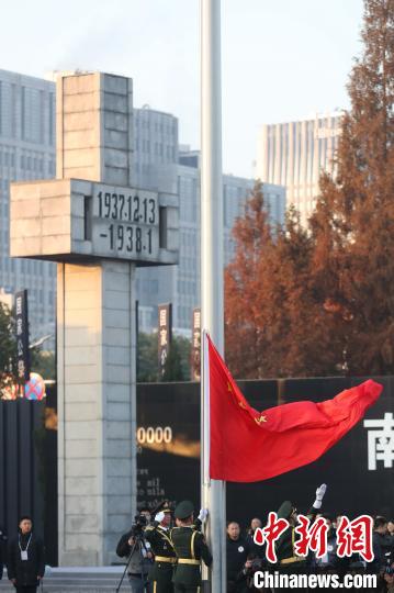 伴随高亢的国歌声,鲜艳的五星红旗冉冉升起;随后下半旗,悼念缅怀南京大屠杀死难者和所有在日本帝国主义侵华战争期间惨遭日本侵略者杀戮的死难者。
