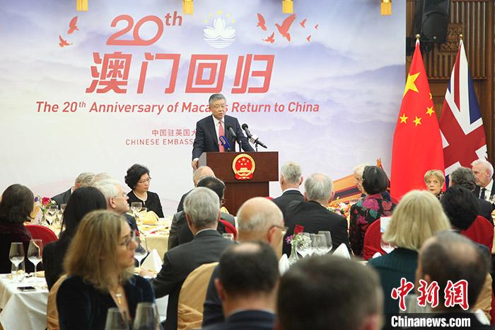 当地时间12月16日晚,中国驻英国大使刘晓明在庆祝澳门回归20周年招待会上发表讲话:凝心聚力,和衷共济,续写“一国两制”成功实践新篇章。中新社发 李尚壕 摄