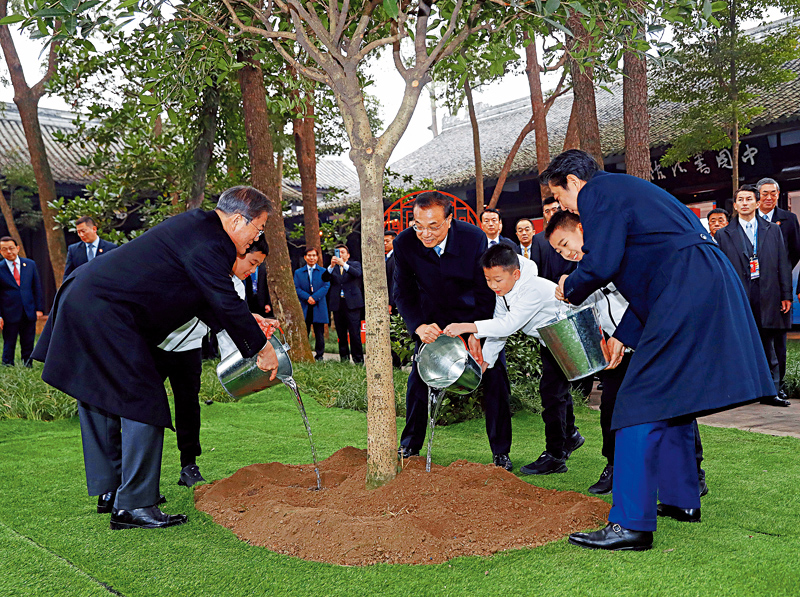 图:24日,国务院总理李克强在四川成都杜甫草堂博物馆与韩国总统文在寅(左)、日本首相安倍晋三(右)共同出席中日韩合作20周年纪念活动,共同种下一棵桂花树\中新社