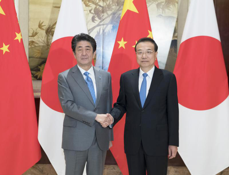 【大公报讯】25日上午,中国国务院总理李克强在四川成都都江堰豪生酒店同日本首相安倍晋三举行会谈。李克强表示,当前中日关系总体保持改善发展势头,这一局面来之不易。希望日方同中方相向而行,为双方开展更多高层交往营造良好条件和氛围。中日双方可在证券、寿险、医疗等现代服务业领域深化合作,培育新的合作增长点;加强投资、创新、第三方市场等领域合作。