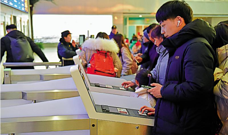 图:二○二○年春运大幕10日开启,“电子客票”等新服务将为旅客带来出行新体验,当日旅客在北京北站使用人脸识别进站闸机检票进站\新华社