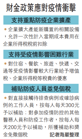 在财政政策方面,财政部副部长余蔚平也表示,中央财政将通过贴息、收储、税费等一揽子政策驰援企业过难关。财政部联合央行首次实施“专项再贷款和财政贴息”这样捆绑发力的政策;对企业多生产的重点医疗防护物资,全部由政府兜底采购;对受疫情影响较大的,住宿、餐饮、旅游、快递、交通等,给予税收优惠;允许直接向医院直接捐赠,对企业和个人捐赠,给予全额税前扣除,减免相关税费等。
