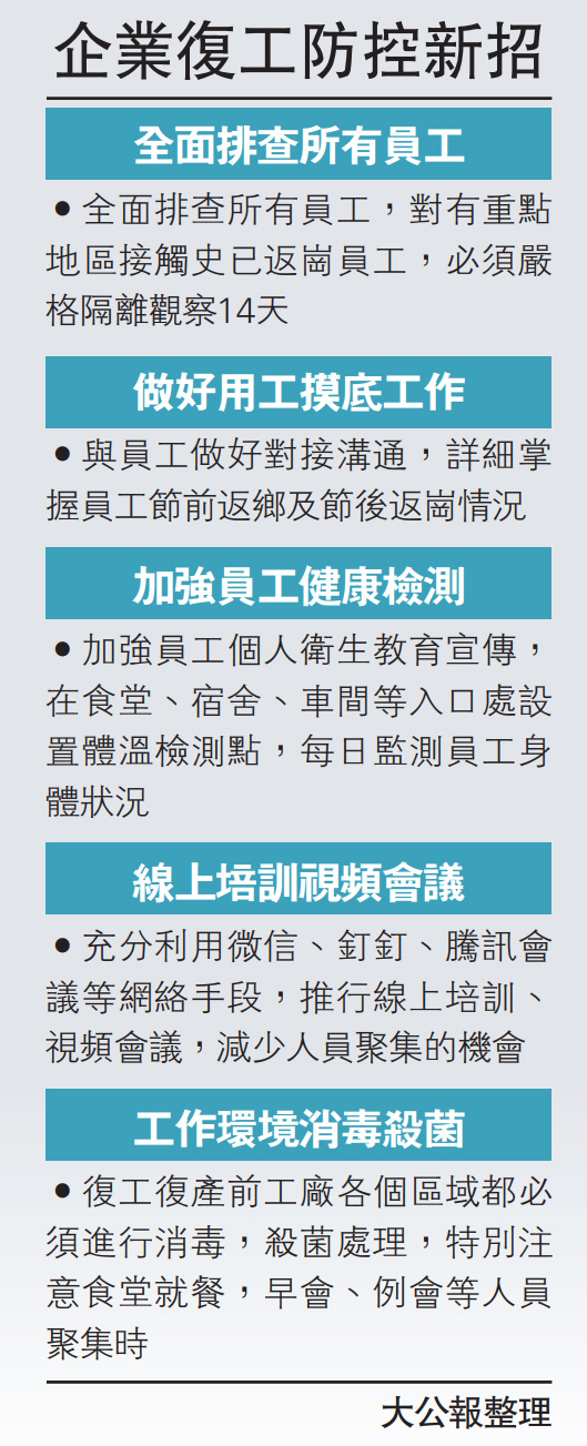 内地复工潮2月10日如期来临。近日,深圳发布16条企业援助措施(下称《若干措施》),保障企业以更低成本平稳渡过疫情难关,减少企业即期负担或支出超600亿元(人民币,下同)。其中包括,部分企业可获2个月免租优惠;对符合条件企业,返还上年度失业保险费的50%;鼓励各银行机构适当下调贷款利率、减免手续费等。\大公报记者毛丽娟 深圳报道