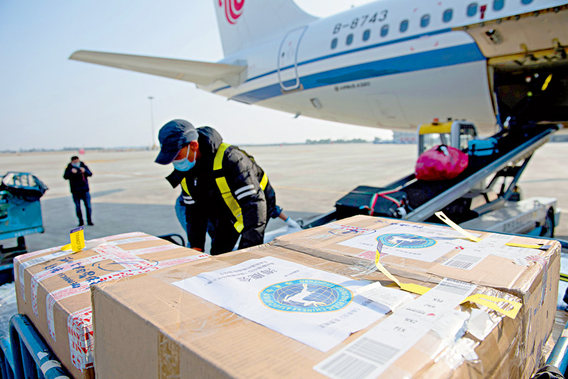 图:2月9日,温州龙湾国际机场工作人员装卸一批来自法国的防疫物资\新华社