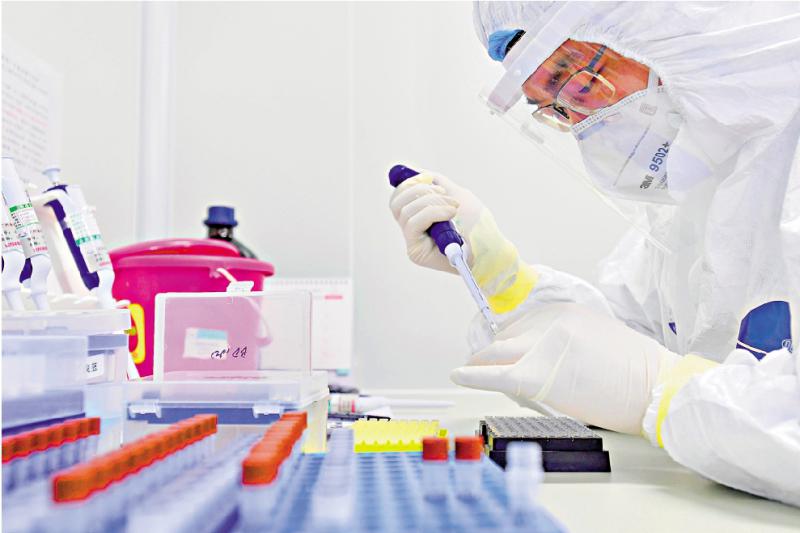 图:广州金域医学检验集团病毒诊断与转化中心技术主管冯力敏在病毒诊断与转化中心实验室进行样本试剂配制\新华社