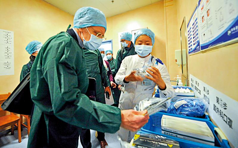 图:23日,中国—世界卫生组织新冠肺炎联合专家考察组在同济医院(光谷院区)现场调研,并与省联防联控机制成员单位负责同志和专家进行交流\中新社